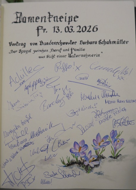 Nachdem der Senior an einige geschichtlichen Ereignisse zum Datum des Tages, wie zum Beispiel an den Beginn der Revolution in Deutschland am 13.3.1848 und der Abdankung von Fürst Metternich in Wien am selben Tag, sowie einem Phänomen, welches 1873 auftrat, als es in Kansas City aufgrund eines Wirbelsturms Frösche regnete, erinnerte, leitete er zügig zu dem Vortrag unserer Bundesschwestern mit dem Titel: „Der Spagat zwischen Beruf und Familie aus Sicht einer Unternehmerin“, über.